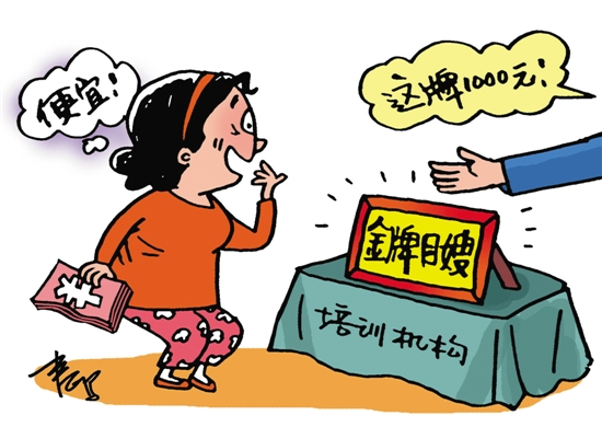 一个很简单的数学题,花个千把两千元,工资就可以涨个两三倍,这条数谁都会算呀!家政服务机构则赚了培训费之余还可以再赚中介费,家政机构与月嫂们可是双赢,至于谁是输家,不言自明。在丰厚的利益之下,速成“金牌月嫂”于是乎应运而生。